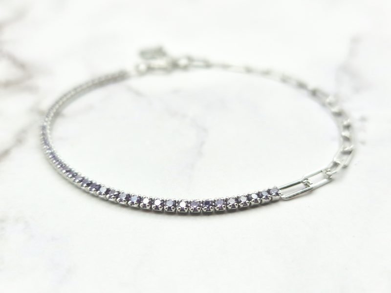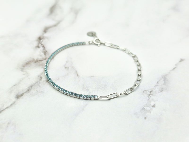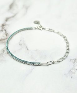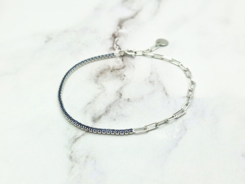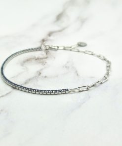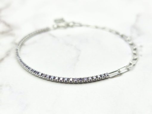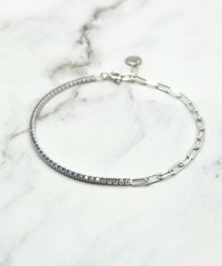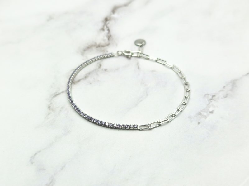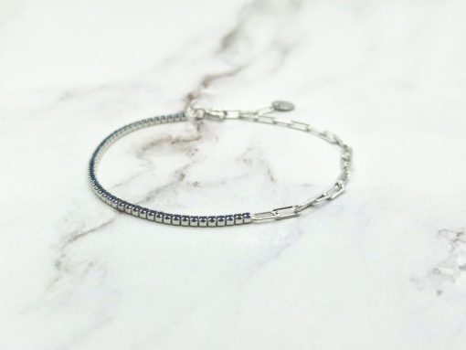 Wat deze armband echt uniek maakt, is de asymmetrische vormgeving. De ene helft is voorzien van stijlvolle schakels, terwijl de andere helft prachtig is ingelegd met glinsterende zirkonia steentjes. Deze subtiele, fonkelende details voegen een vleugje glamour toe aan je look.