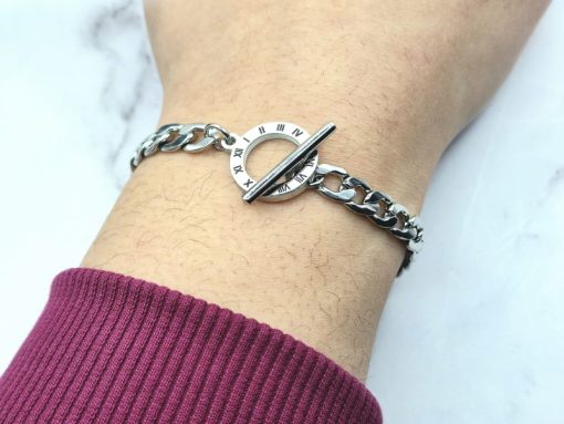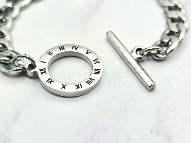 Een prachtige armband met de perfecte balans tussen stoer en minimalistisch voor mannen. Met zijn verfijnde ontwerp trekt deze armband de aandacht met de Romeinse cijfers als opvallend element. Elk cijfer is zorgvuldig gegraveerd op de duurzame roestvrij stalen band, waardoor een tijdloos en klassiek effect ontstaat.
