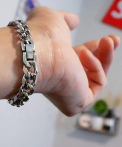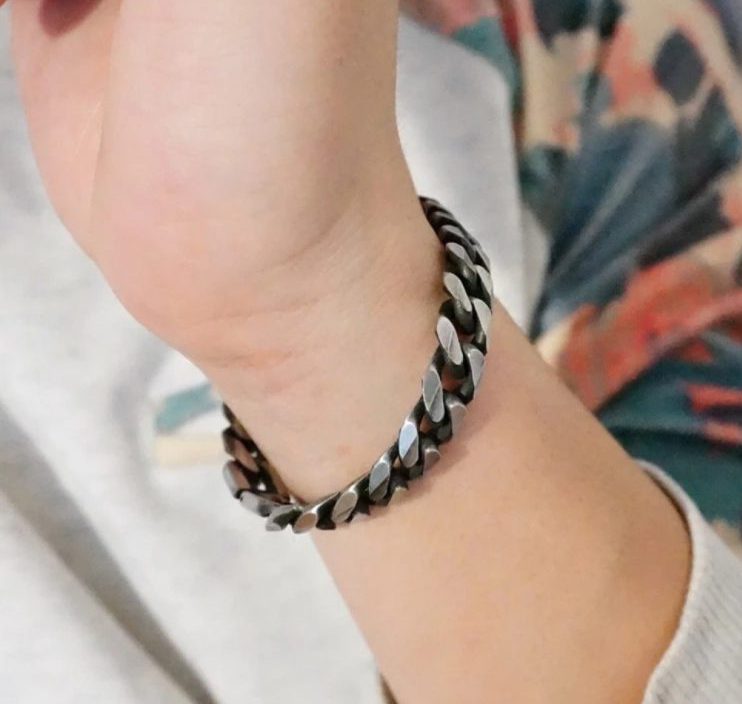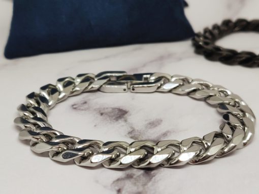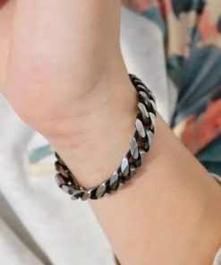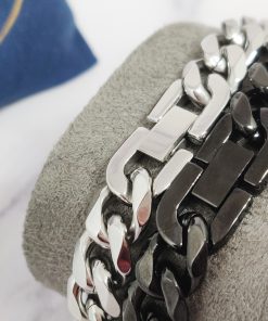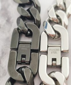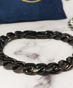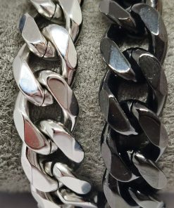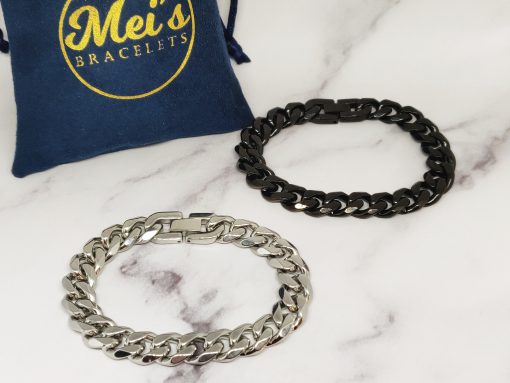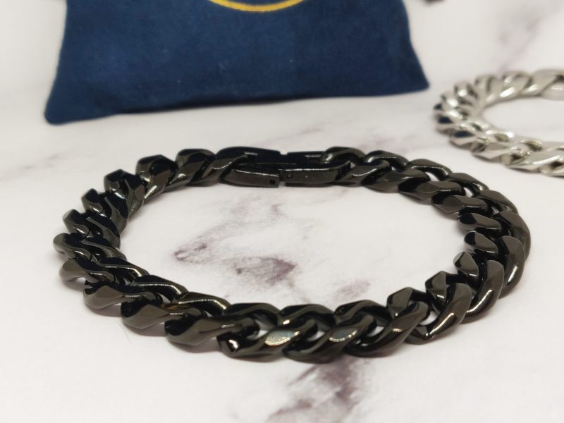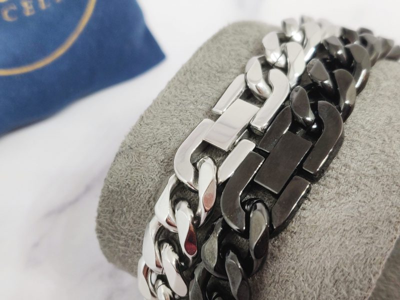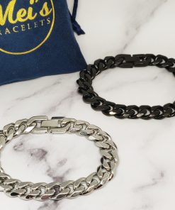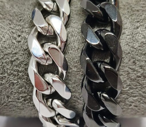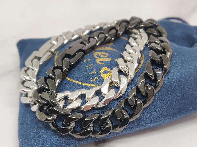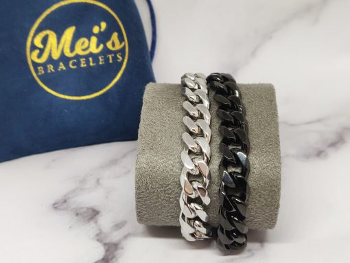 Een mooie robuuste schakelarmband voor dames en heren van roestvrij staal 316L. Deze armbanden zijn in de kleuren zwart en zilver, met polsmaat (zwart) 17,5 cm en (zilver) 17 cm.
