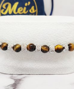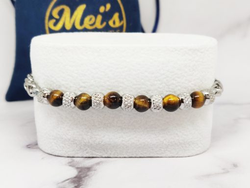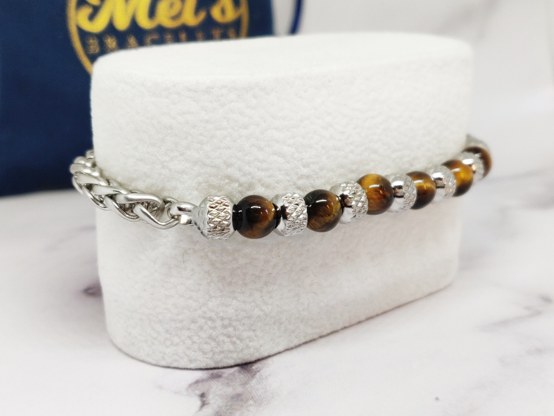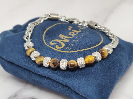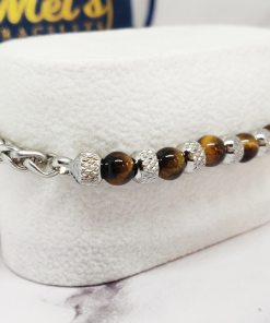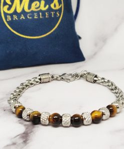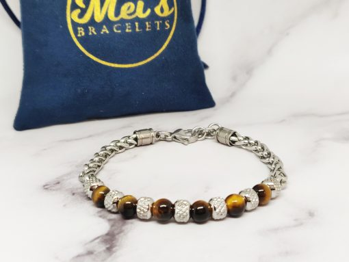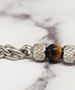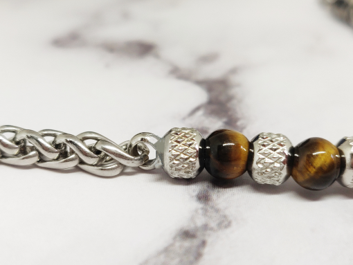 Een stoere armband van Stainless Steel en kralen van tijgeroog. Je kan deze armband met de polsmaat 17,5 tot 19,5 centimeter dragen en het is gemakkelijk om je pols te doen met de kreeftklauwsluiting.
