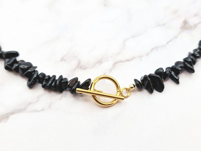 Ontdek de verfijnde schoonheid van deze chokerketting, volledig samengesteld uit zwarte toermalijn edelstenen met een organisch, oneven karakter. De onregelmatige kralen geven het ontwerp een stoere, natuurlijke uitstraling en maken elke ketting uniek. Een krachtig accessoire dat moeiteloos elke outfit een edgy, maar stijlvolle touch geeft.