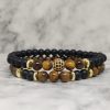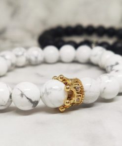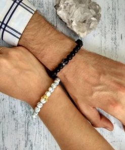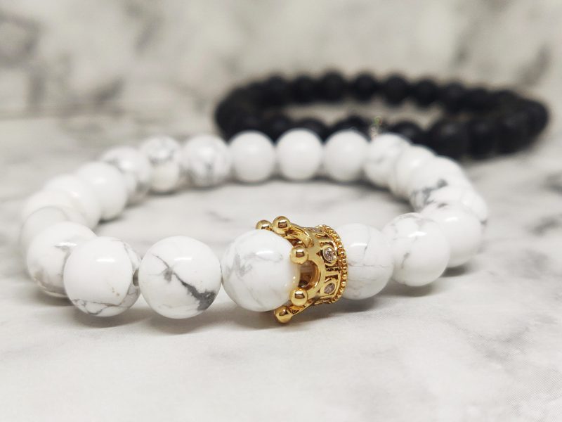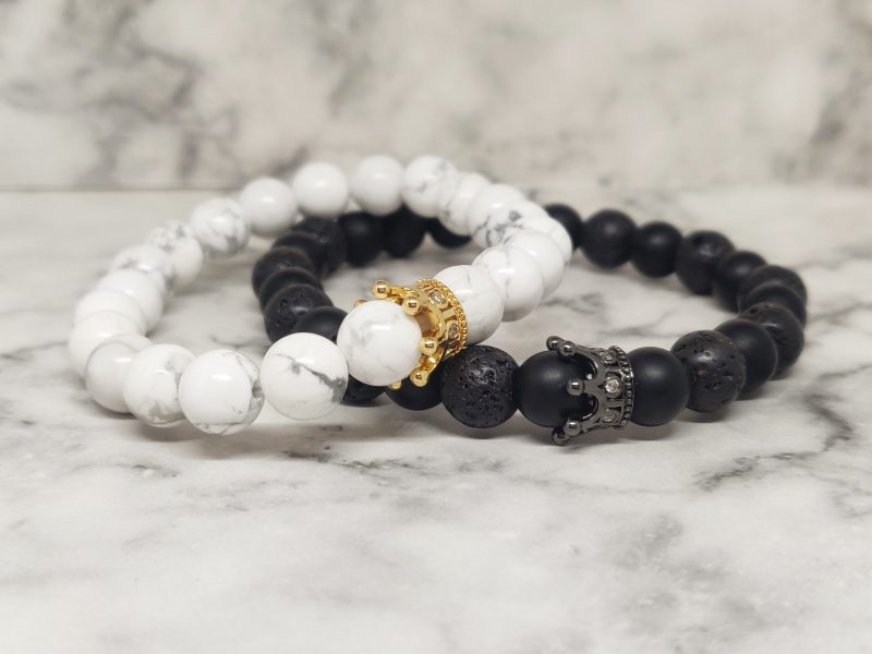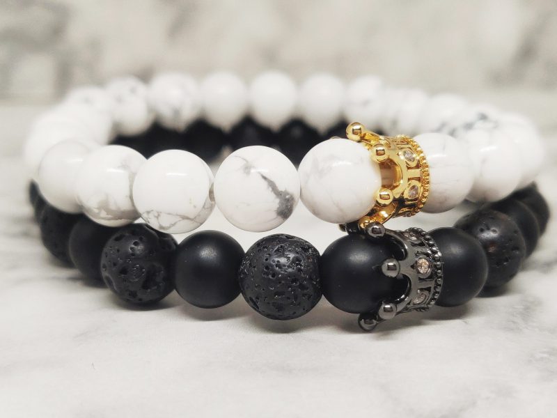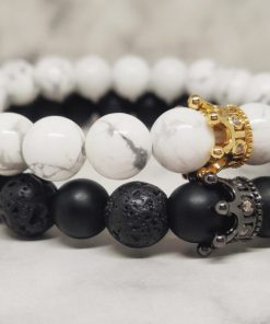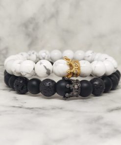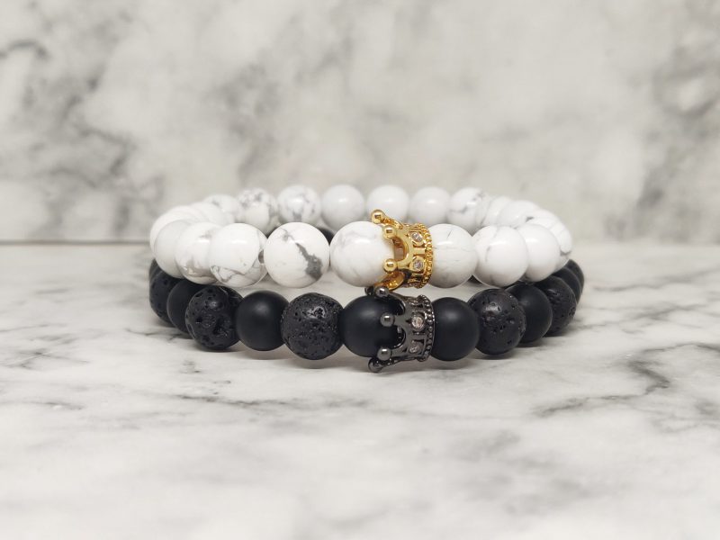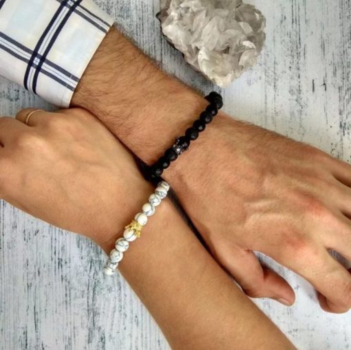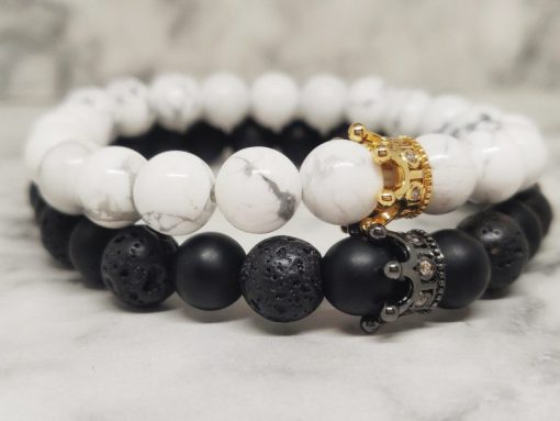 Een Yin en Yang armbanden set, met kralen van de edelstenen Lavasteen en Howliet. Deze set is geschikt voor koppels.