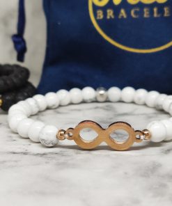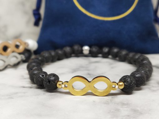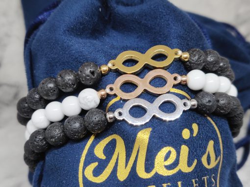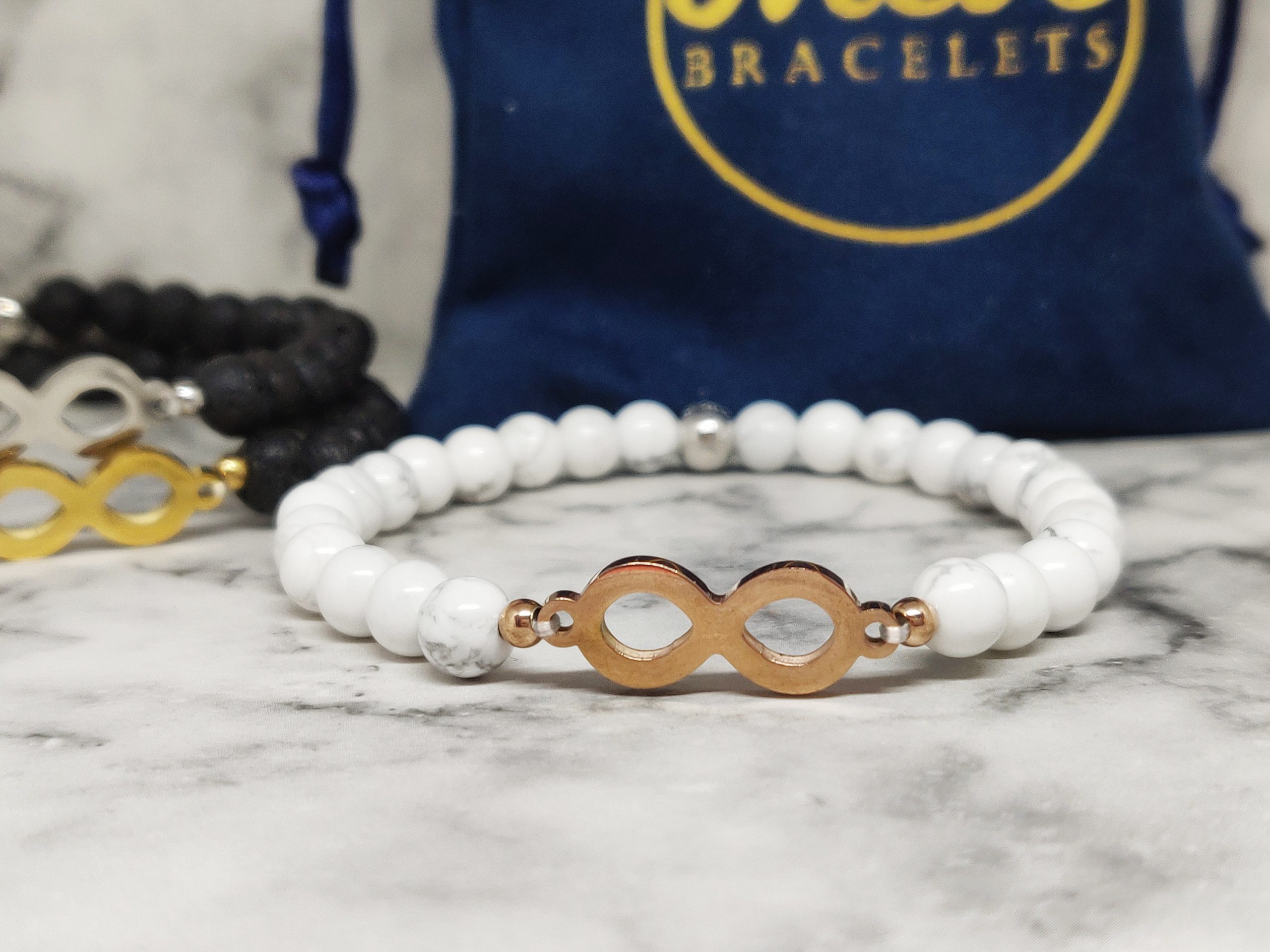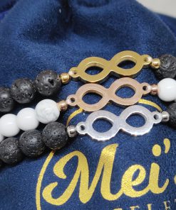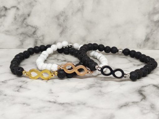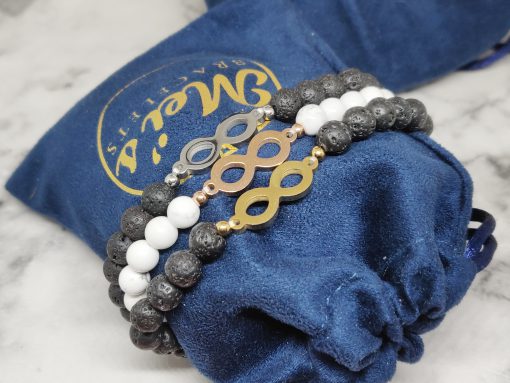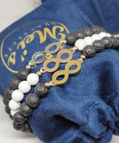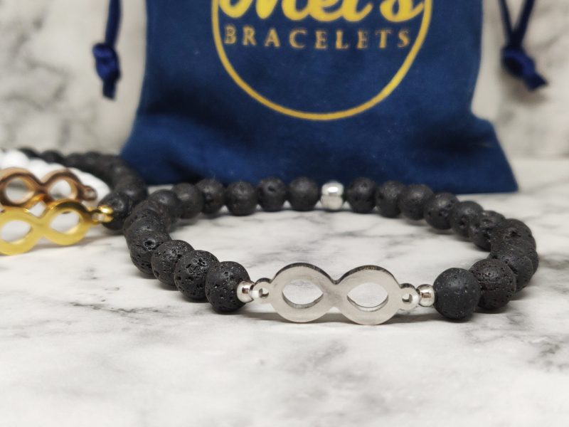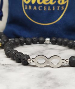 Handgemaakte Ininity armband van edelsteen en stainless steel in polsmaat 16,5cm en 18,5cm. Je kunt bij deze armband kiezen uit de stenen Lavasteen of Howliet. Daarnaast bevat deze armband een infinity teken als tussenkraal en natuurlijk onze signature kraal van stainless steel. Deze armband kun je dragen om jouw liefde te erkennen, maar je kunt het ook dragen als koppel, vriendschap of familie.