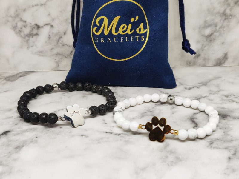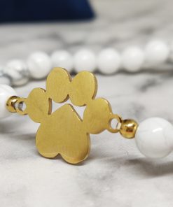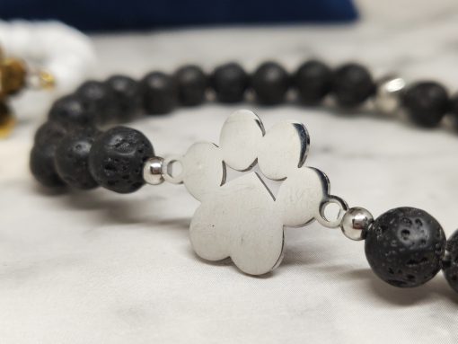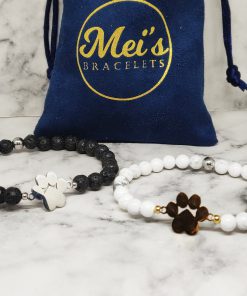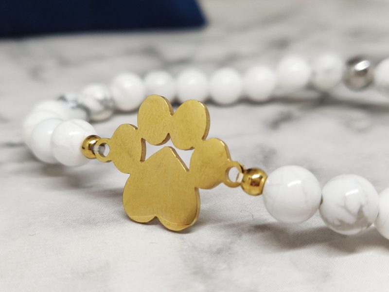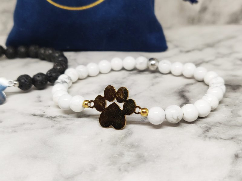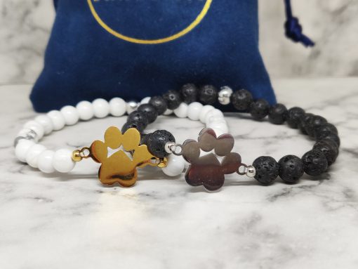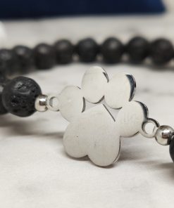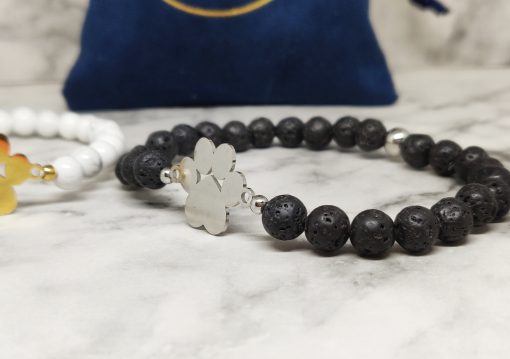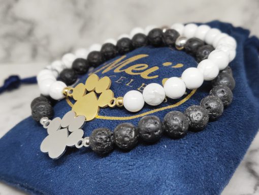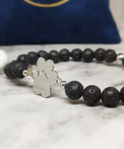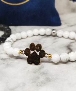 Handgemaakte armband van edelsteen en stainless steel in polsmaat 16,5cm en 18,5cm. Je kunt bij deze armband kiezen uit de stenen Lavasteen of Howliet. Daarnaast bevat deze armband een pootje als connector en natuurlijk onze signature kraal van stainless steel. Deze armband kun je dragen om jouw liefde voor je huisdier te erkennen.