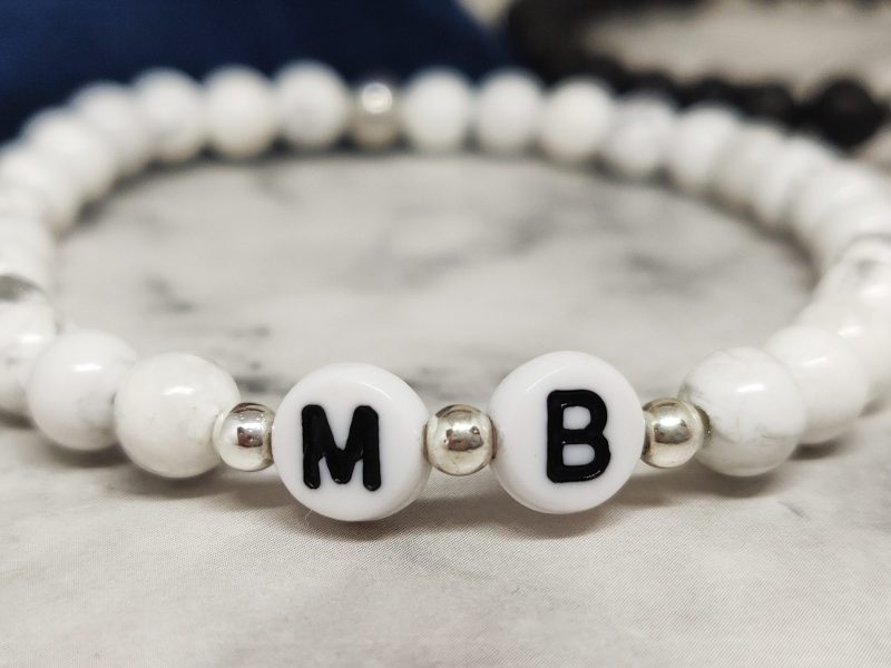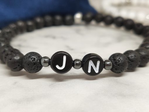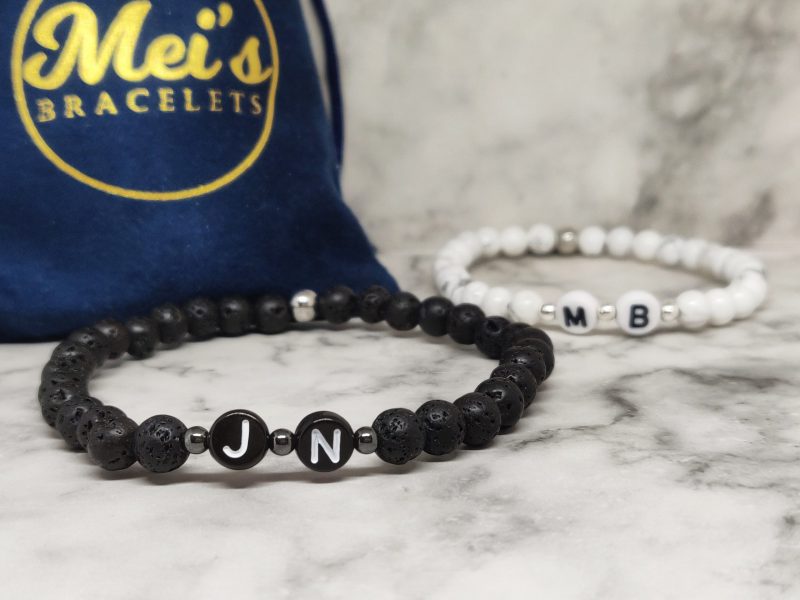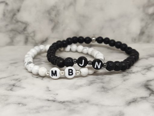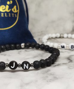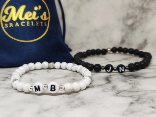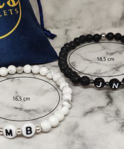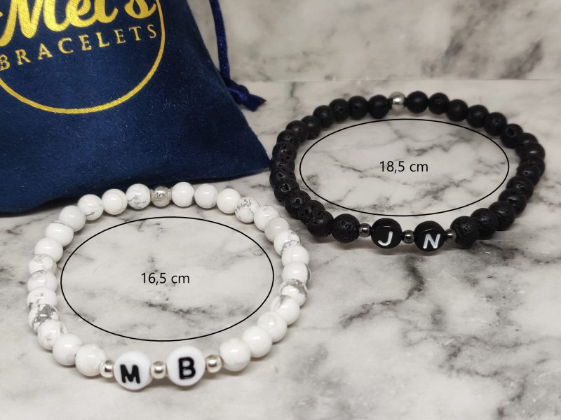 Handgemaakte armband met de voorletter van jou en je geliefde in polsmaat 16,5cm en 18,5cm. Deze armbanden zijn gemaakt van Lavasteen, Howliet, 316L, acryl en natuurlijk is onze signature kraal ook van stainless steel. Deze set is niet alleen geschikt voor koppels maar ook voor vriendschap en familie. Ideaal voor lange afstandsrelatie of om zo de kracht in de relatie te behouden.