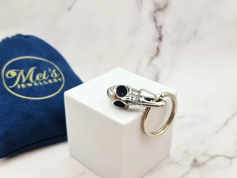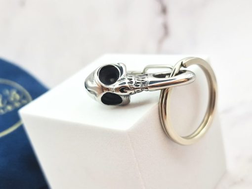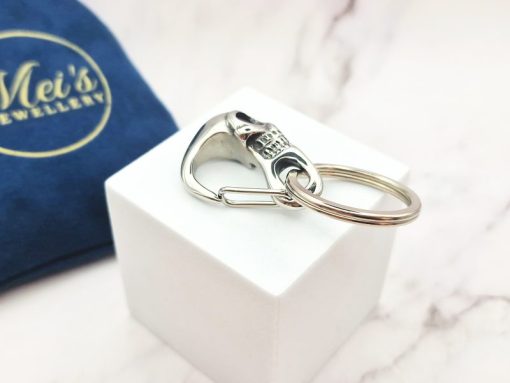 Een stoere en eigenzinnige sleutelhanger met een badass doodshoofd. Gemaakt van 316L roestvrij staal (RVS), wat zorgt voor duurzaamheid én een krachtige uitstraling. Het karabijnhaak-ontwerp maakt het eenvoudig om ‘m aan je broek, tas of sleutelbos te bevestigen.