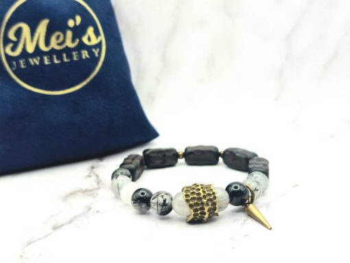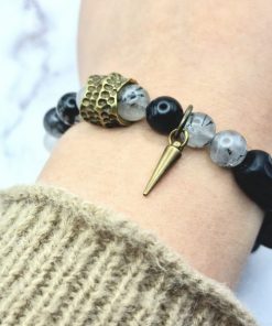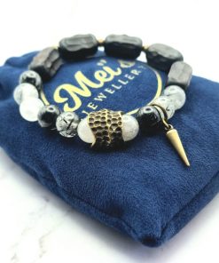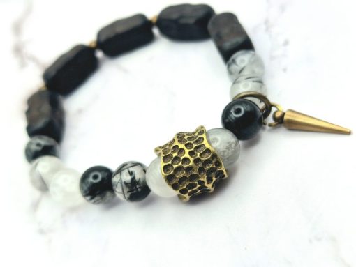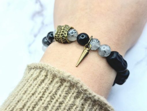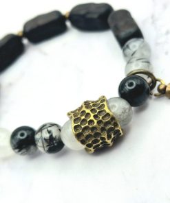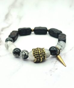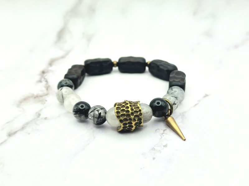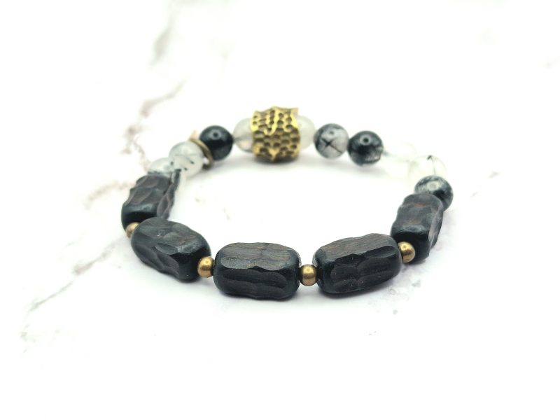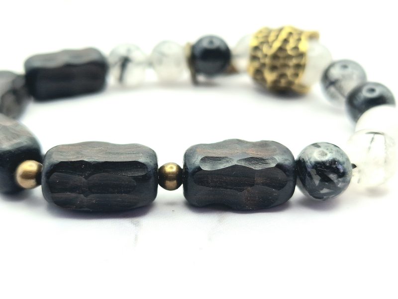 Een prachtige armband voor vrouwen is gemaakt van ebbenhout, edelsteen en koper. Deze armband is ontworpen om te passen om polsmaten van 15,5 cm tot 17,5 cm en is gemakkelijk om te doen. De armband is een veelzijdig accessoire dat bij elke outfit past.