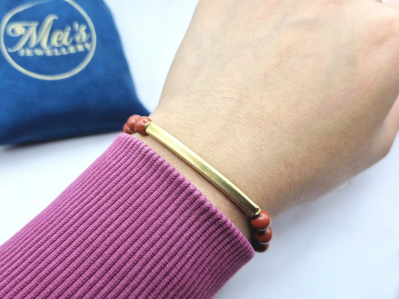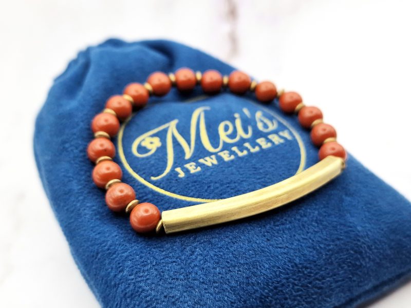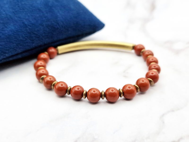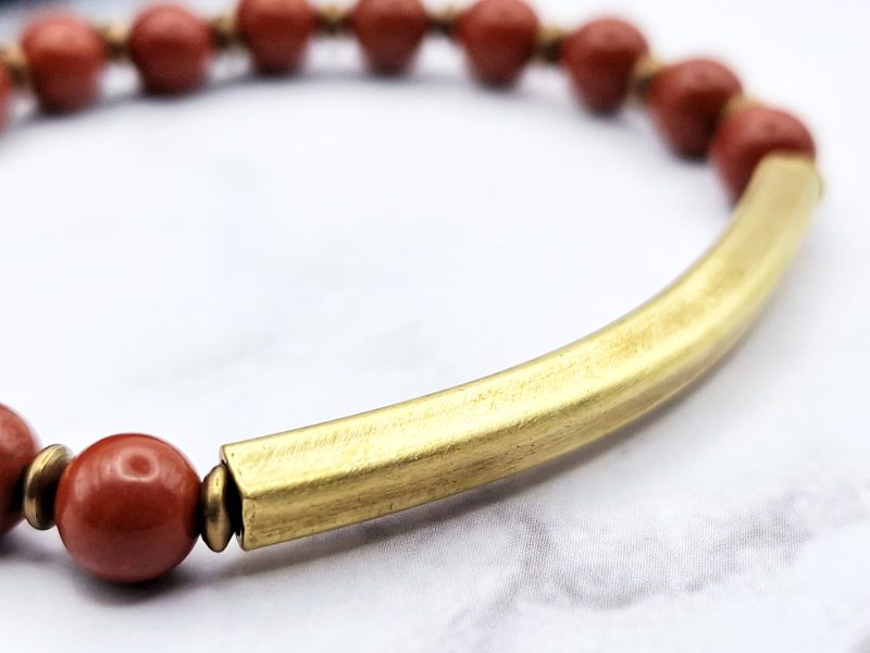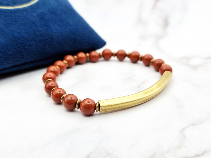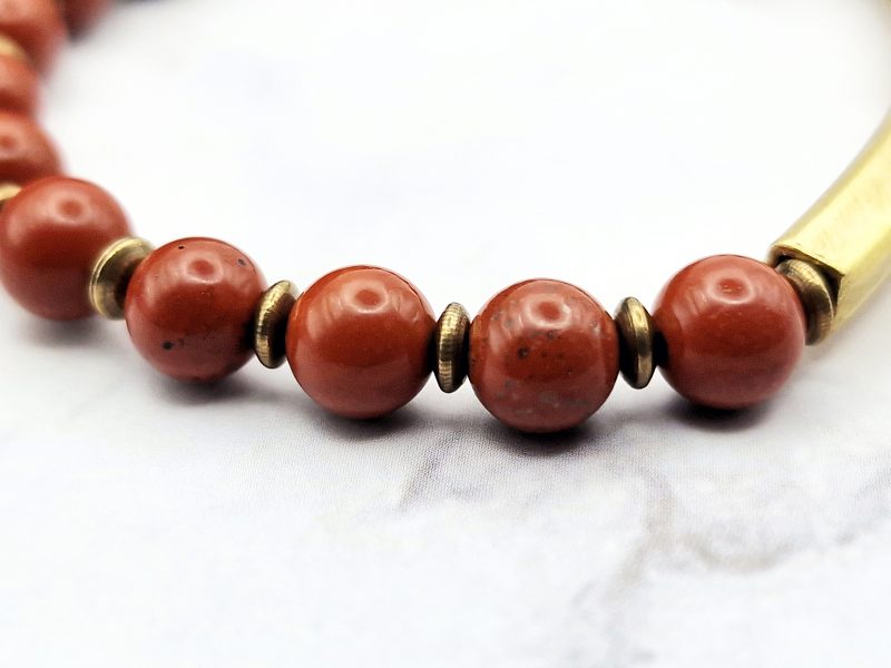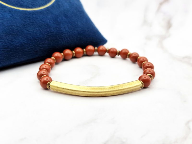Ontdek de Red Harmony armband – een minimalistische edelsteen armband gemaakt met echte rode jaspis kralen en warme koperen accenten.