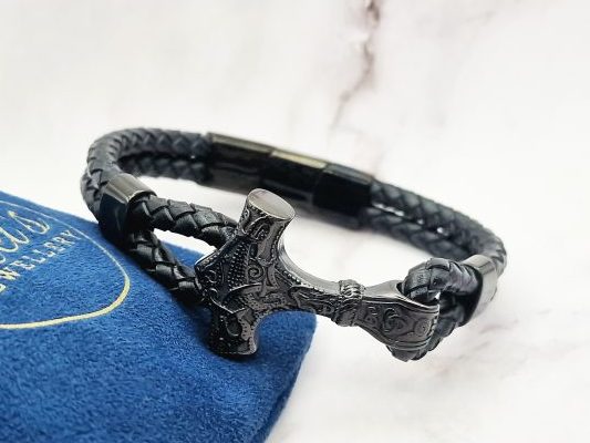 Een stoere Viking armband welk combineert tussen een tijdloos design met praktische veelzijdigheid. Gemaakt van gevlochten echt leer in diepzwart, straalt deze armband pure mannelijkheid uit. De iconische Mjölnir – Thor’s hamer – is vervaardigd uit duurzaam 316L roestvrij staal met een zwarte afwerking, wat zorgt voor een robuuste en mysterieuze uitstraling.