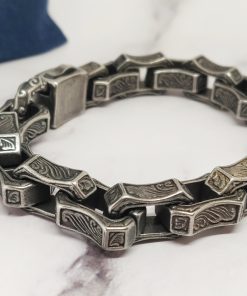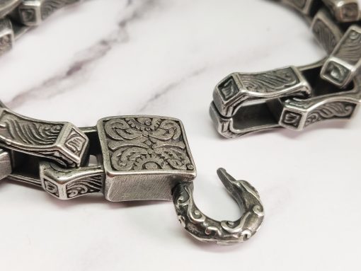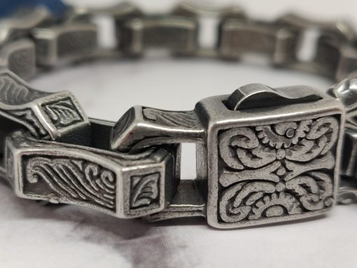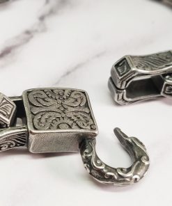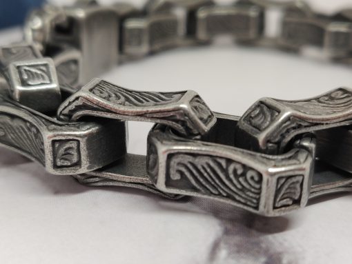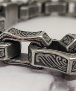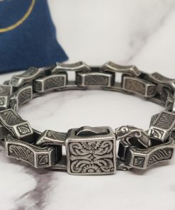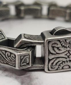 Een stoere Viking armband voor mannen en te dragen met polsmaat 18 cm en 20 cm. Deze armband is volledig van 316L Roestvrij staal, oftewel Stainless steel. Daarnaast kan je deze armband gemakkelijk om je pols te doen met de sluiting waar je op klikt om het los en vast te maken. Hierdoor zit de armband stevig vast om je pols.