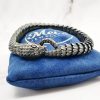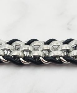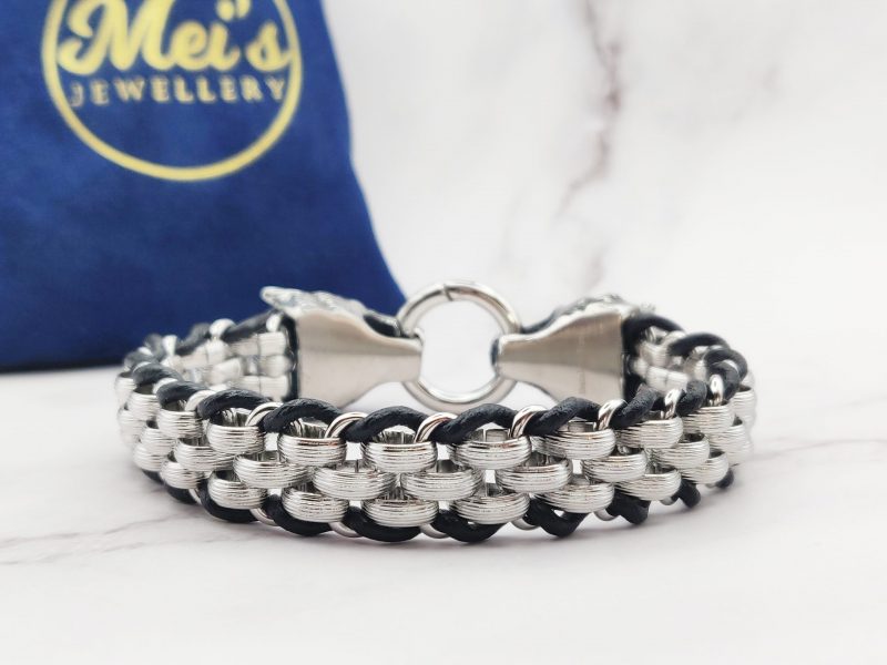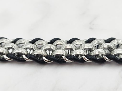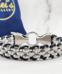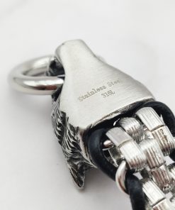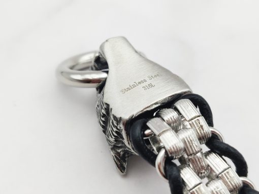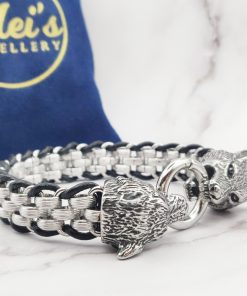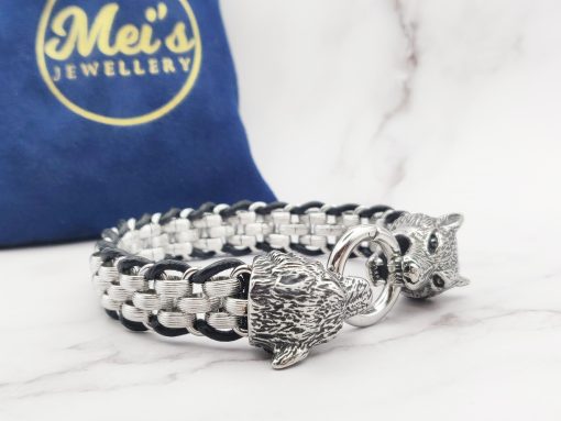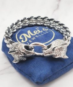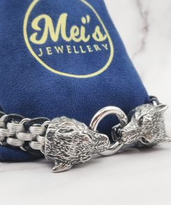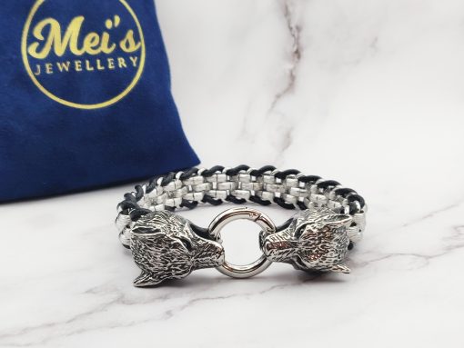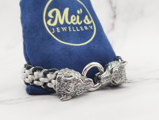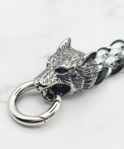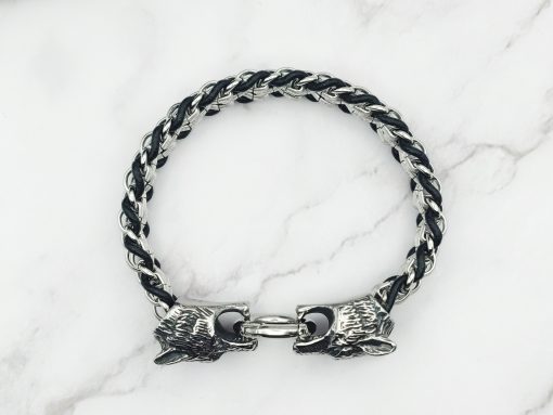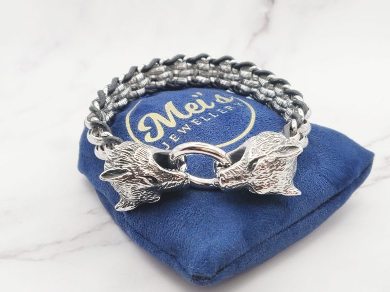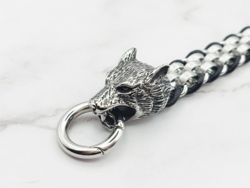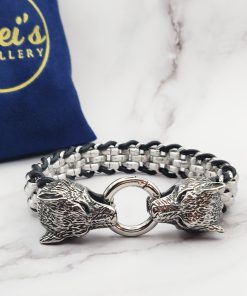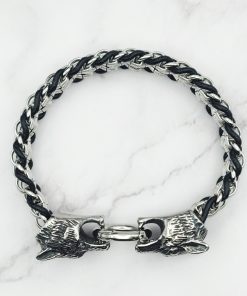Een stoere, tijdloze en duurzame armband met symbolen uit de Oud-Noorse tijd. De wolven symboliseren de wolven van Odin: Geri en Freki. Deze armband kan je dragen met polsmaat 18 cm en 20,5 cm. Het is gemakkelijk de armband om de pols te doen, je hoeft alleen maar de wolvenkop tegen de ring aan te duwen. Daarnaast heeft deze armband een sterke maar toch soepele constructie vanwege het roestvrij staal en het echt leer.