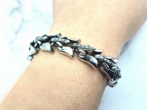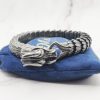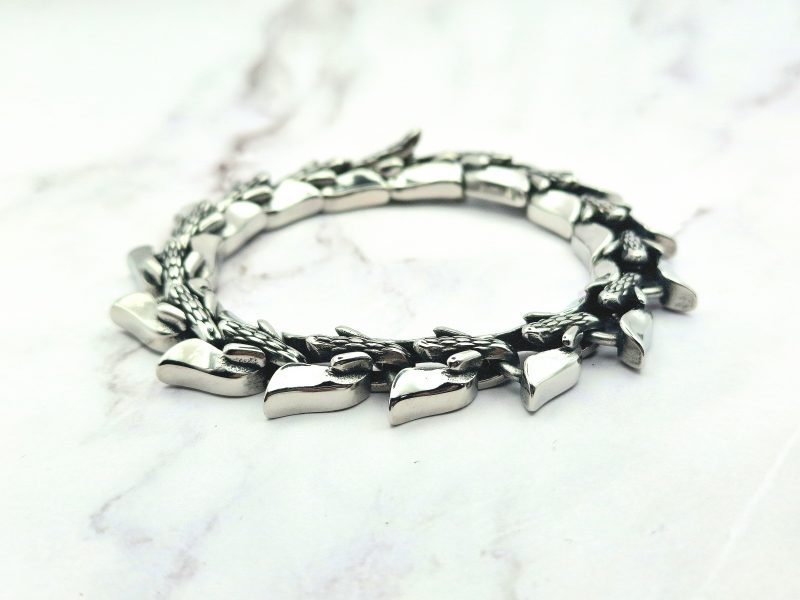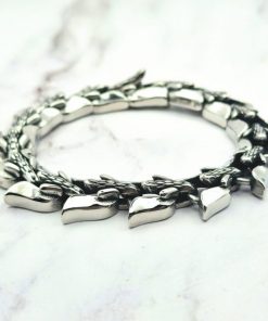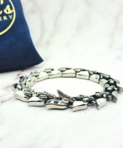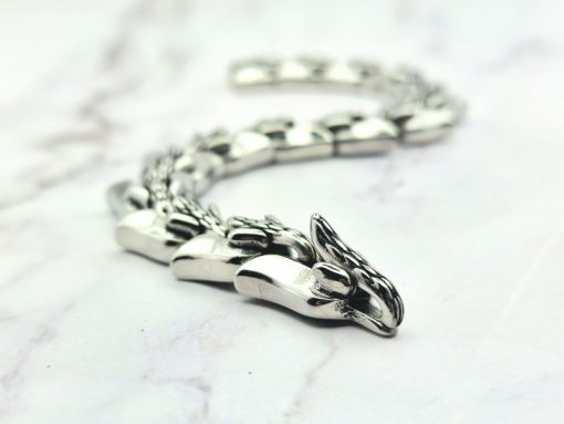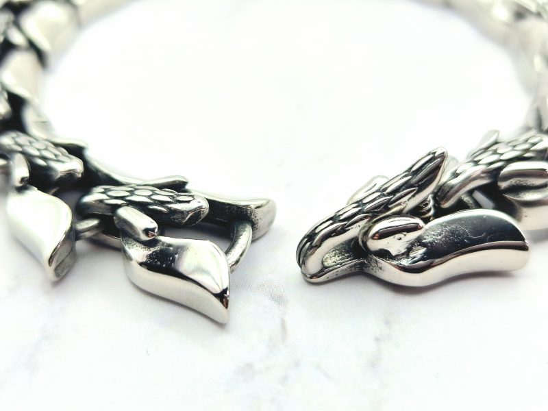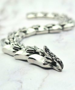 Een unieke Viking armband voor de echte fans van het oude Noorse kunst. Je kan deze armband dragen met polsmaat 16,5 cm en 19 cm en als je van een lossere fitting houdt kan je het met 0,5 cm maat kleiner dragen. Het is gemakkelijk de armband om de pols te doen, je hoeft alleen maar de bek van de draak open te doen. Daarnaast heeft deze armband een soepele maar toch sterke constructie vanwege het roestvrij staal.