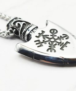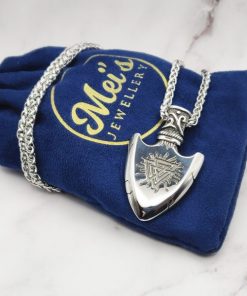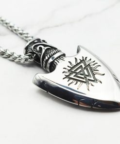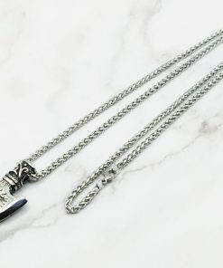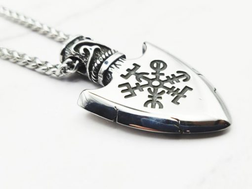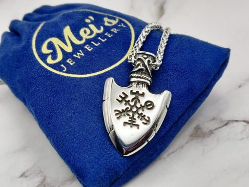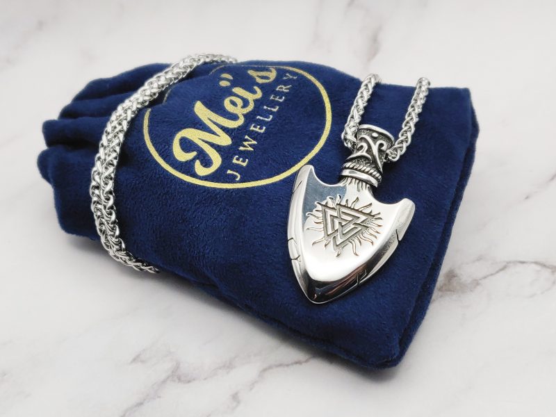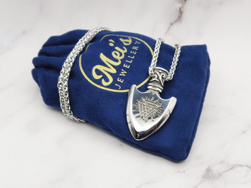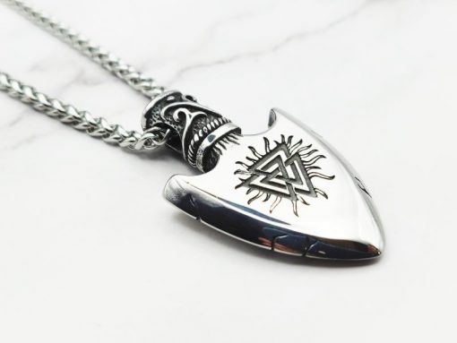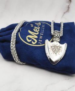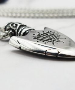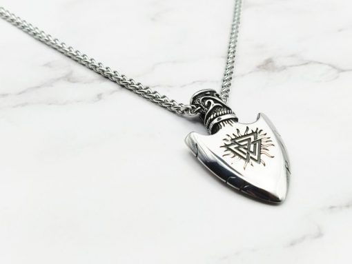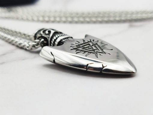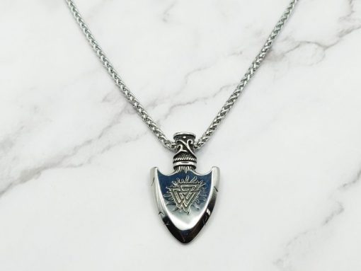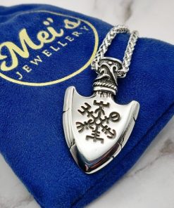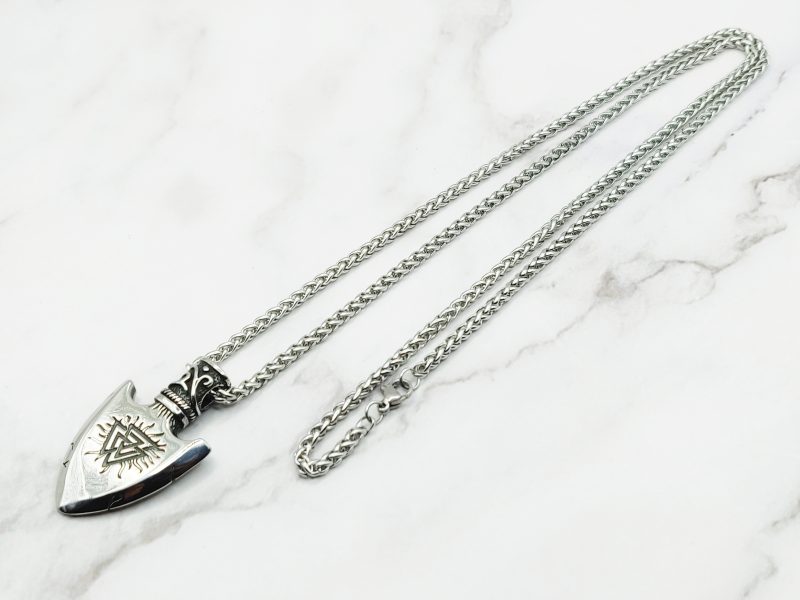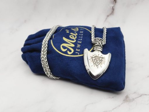 Een stoere, tijdloze en duurzame ketting met symbolen uit de Oud-Noordse tijd, Valknut en Vegvisir. Aan elke kant van de speer zit een Noorse symbool, dat maakt deze ketting uniek en je kan het dragen zoals jij het wilt. Deze antieke viking ketting is van roestvrijstaal, ook wel 316L of Stainless Steel. Je kan de ketting gemakkelijk om de nek doen met maat 50 en 70 cm en doormiddel van de kreeftklauwsluiting.