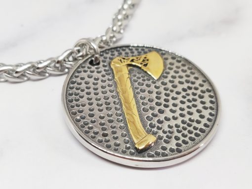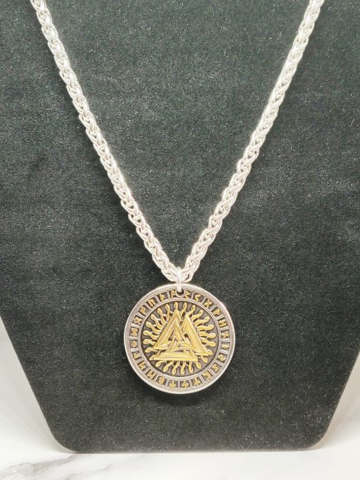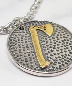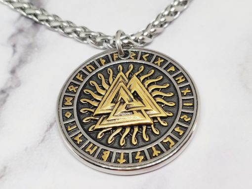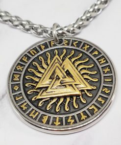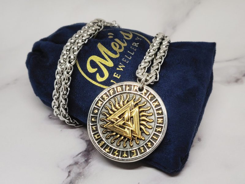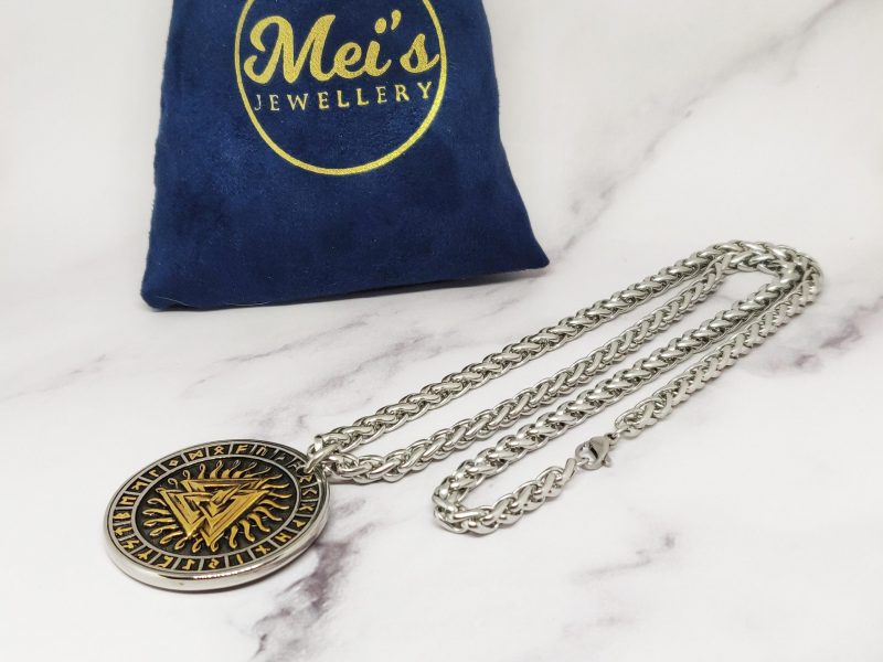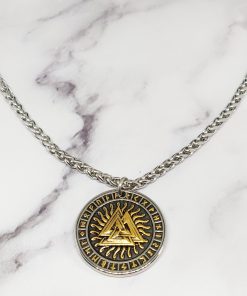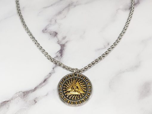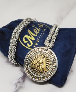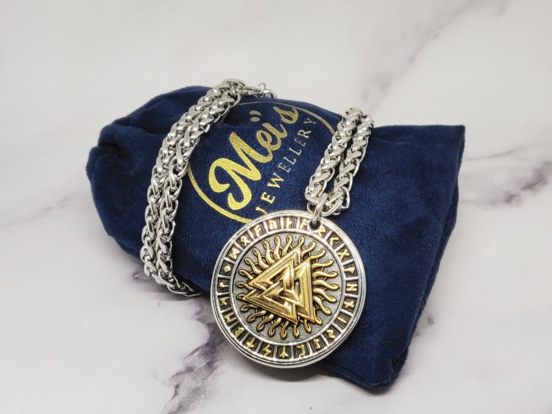 Een stoere, tijdloze en duurzame ketting met symbolen uit de Oud-Noorse tijd, Valknut, runenschrift en een bijl op de achterkant. Deze antieke viking ketting is van roestvrij staal, ook wel 316L of Stainless Steel. De ketting kan je gemakkelijk om de nek doen met maat 50 cm en 70 cm, doormiddel van de kreeftklauwsluiting.