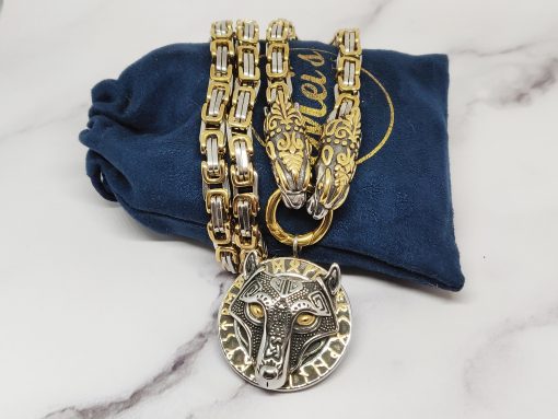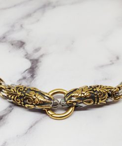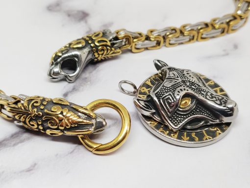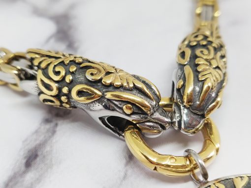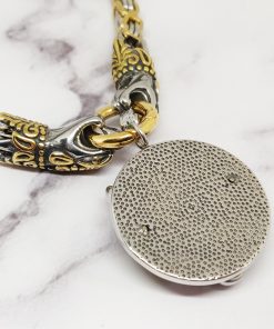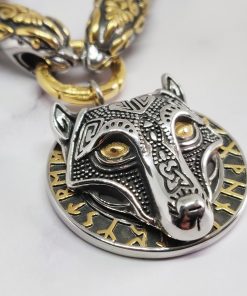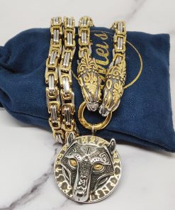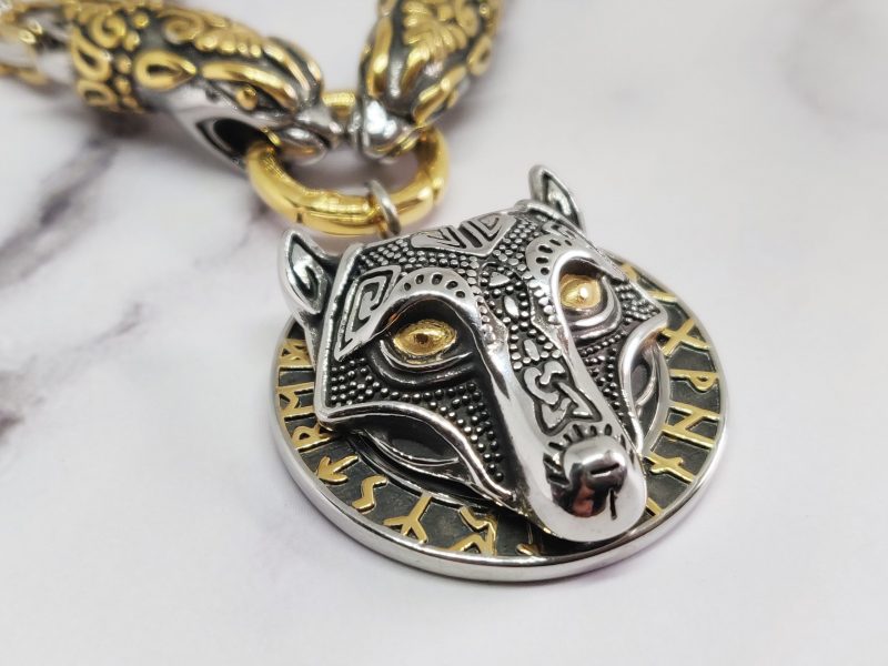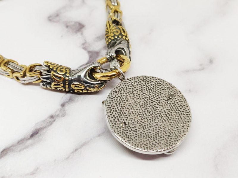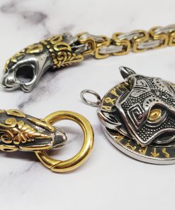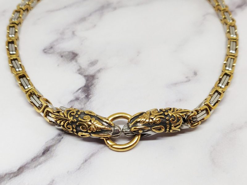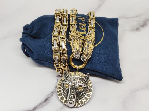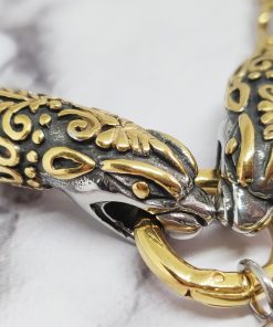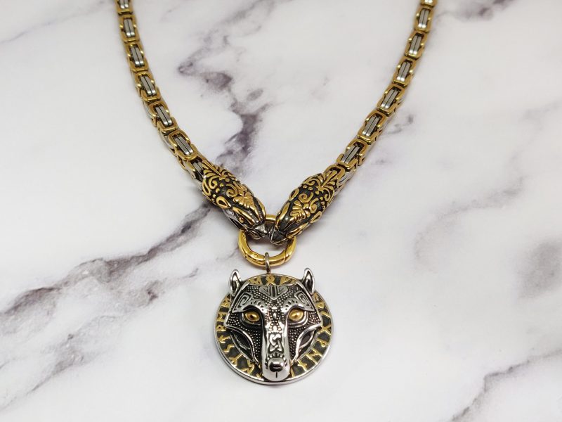 Een stoere, tijdloze en duurzame ketting met een wolvenhoofd als hanger en twee drakenhoofden die het vasthouden. Deze antieke viking ketting is helemaal van 316L roestvrij staal (RVS) in maat 70 cm. Je kan deze ketting ook zonder de pendel dragen, je kan namelijk de hanger van de ring afschuiven door de ring in te duwen.