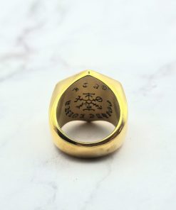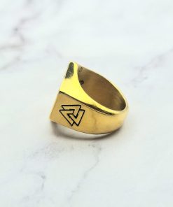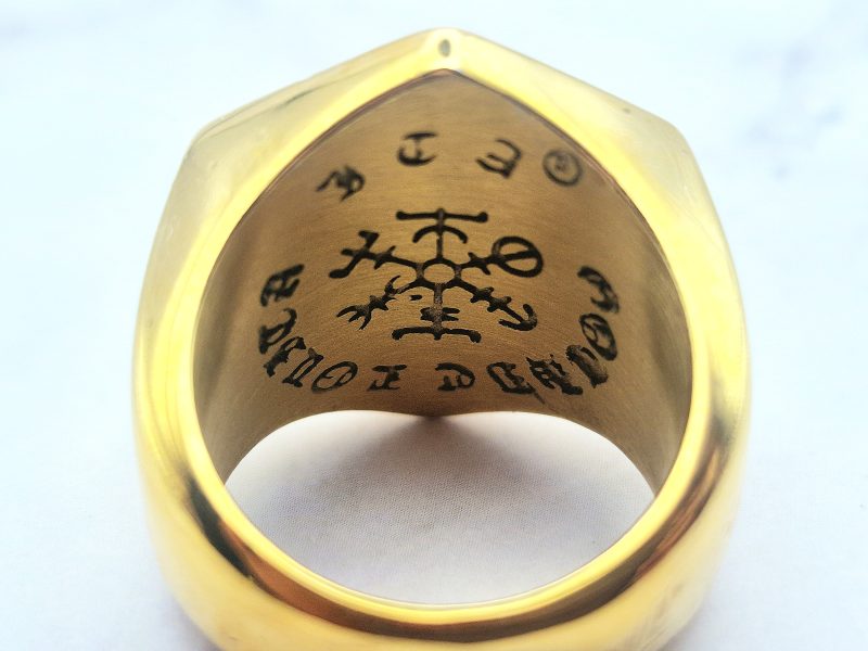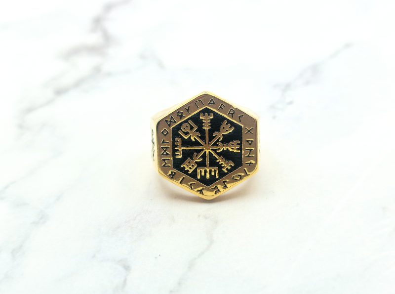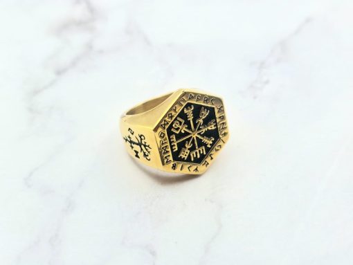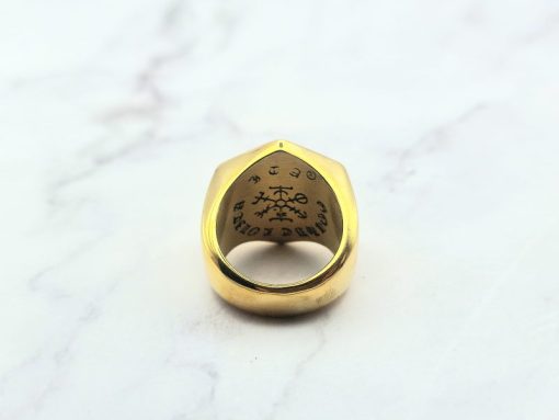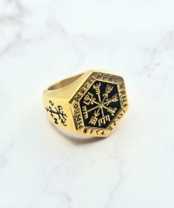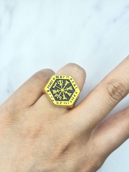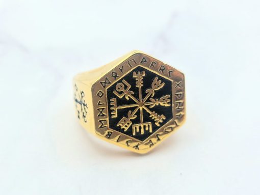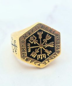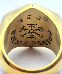 Een robuuste zegelring met een diepe betekenis voor liefhebbers van Vikingen. De verfijnde gravures van oud-Noorse symbolen geven de ring een mysterieuze en krachtige uitstraling. Deze buitengewone ring is speciaal ontworpen in ringmaten van 56 mm, 61 mm en 67 mm, en vervaardigd van hoogwaardig 316L roestvrij staal. Hierdoor is de ring niet alleen uiterst duurzaam, maar ook prachtig en tijdloos in zijn ontwerp. Al met al is deze ring een juweel dat schoonheid en langdurige kwaliteit harmonieus combineert, waardoor het een waardevol en betekenisvol accessoire wordt voor degenen die de rijke Viking-cultuur en symboliek omarmen.
