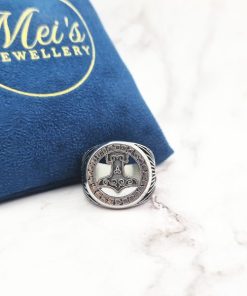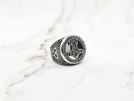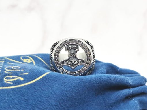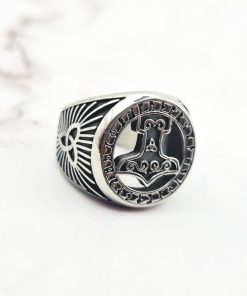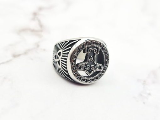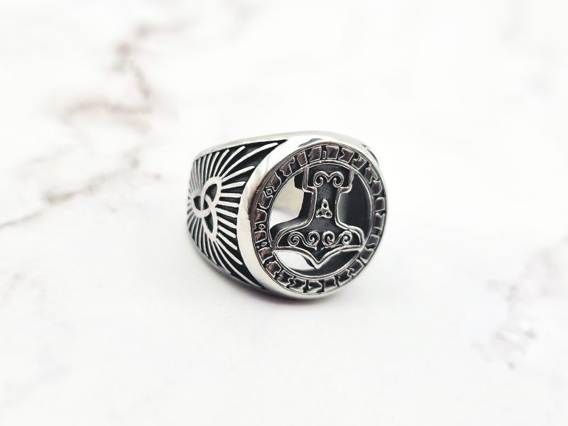 Een opvallende én stoere zegelring met de krachtige Mjölnir hamer van Thor, het runenschrift en triquetra. Deze ring kan je dragen met ringmaat 55 mm, 60 mm & 65 mm en vervaardigd van roestvrij staal. Het is een symbool van kracht en bescherming, daarnaast combineert het gedurfde design met duurzame kwaliteit. Voeg een vleugje dapperheid toe aan jouw stijl door deze ring te dragen.