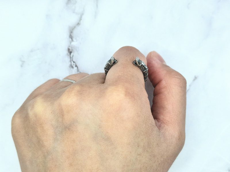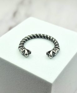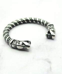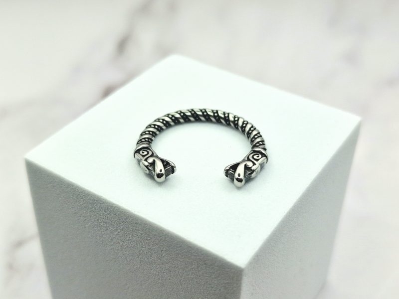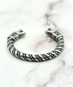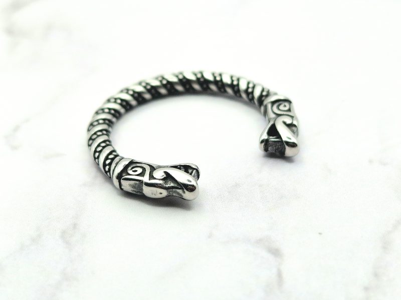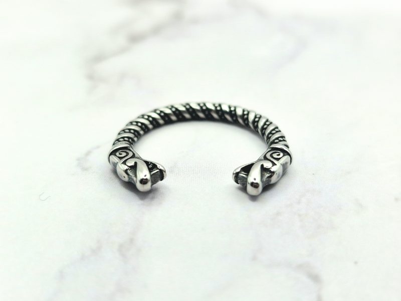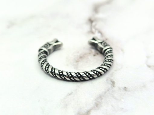 Deze Viking-ring combineert opvallend modern design met historische elementen, zoals het gedetailleerde filigraandraad. Het is vervaardigd met behulp van authentieke technieken die door Vikingen werden gebruikt voor het maken van o.a. ringen. Aan elke kant van deze ring bevindt zich een trouwe replica van een Gotlandse drakenkop, wat een opvallend kenmerk is.