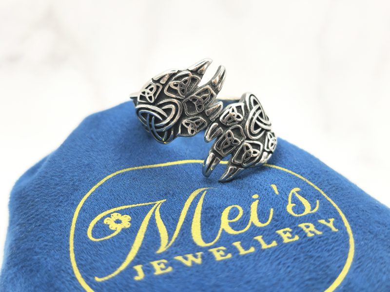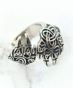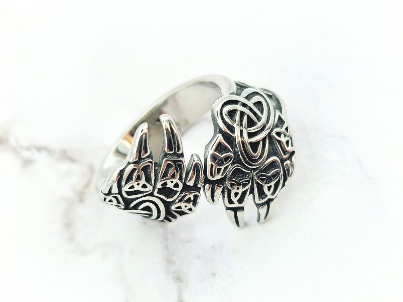 Een stoere én duurzame ring met de poten van de wolf aan elk uiteinde. Deze Viking ring is volledig vervaardigd uit 316L roestvrij staal (RVS) en kan je dragen met ringmaat 61 mm. Niet alleen voegt deze ring een extra vleugje toe aan je outfit, maar het heeft ook een speciale betekenis. Elk detail oogt een tijdloze schoonheid, terwijl het roestvrije staal zorgt voor langdurige duurzaamheid.